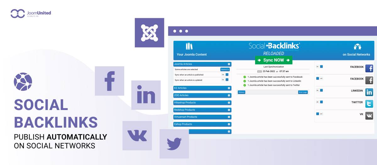 Social Backlinks automatically posts your Joomla, K2, ZOO, Hikashop, RedSHOP and Virtuemart selected content to Facebook, X, LinkedIn and Vkontakte.